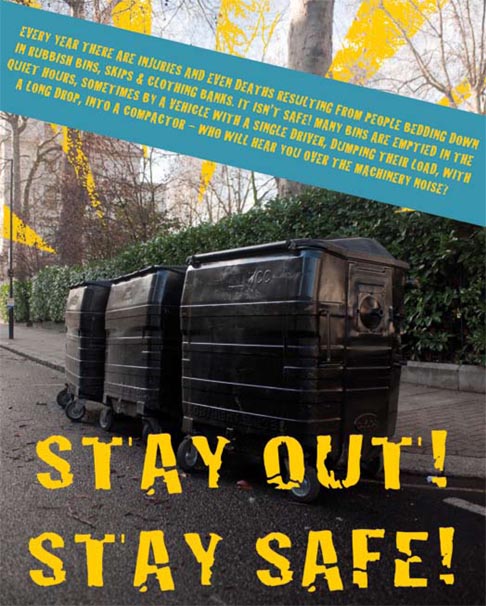 Biffa, like other waste management companies, has also introduced lockable tops and warning stickers on bins, although how effective such stickers are is unclear. The bin slept in by the two men in San Antonio had warning stickers on, and warning stickers were introduced in Brighton long before the death of teacher Scott Williams, who was crushed in a rubbish lorry after falling asleep in an industrial bin. Following that accident, in July 2009, City Clean “upgraded” its warning stickers on large bins and worked with the council’s homeless team to put up posters in hostels and other buildings visited by rough sleepers to warn them of the danger of sleeping in bins.