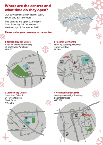 Every winter Crisis run Crisis at Xmas, a network of day centres across the UK covering Christmas and some of the surrounding days. For Crisis at Xmas 2022 there will be four centres in London running from 24-28 December 2022, 11am-5pm. A map of how to get to the centres, which are spread across north, east, south and west London, can be found on page 19.