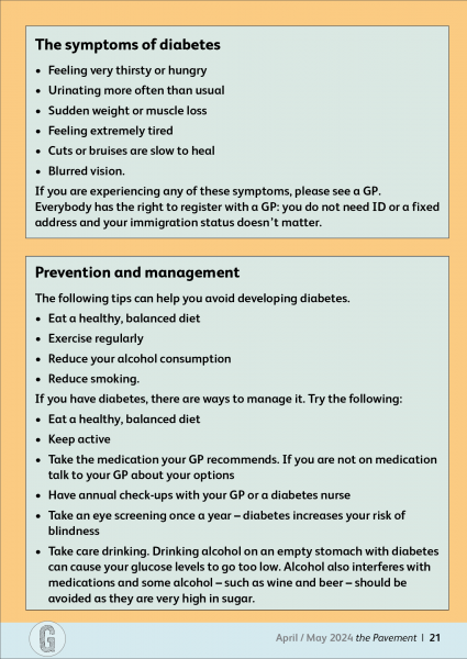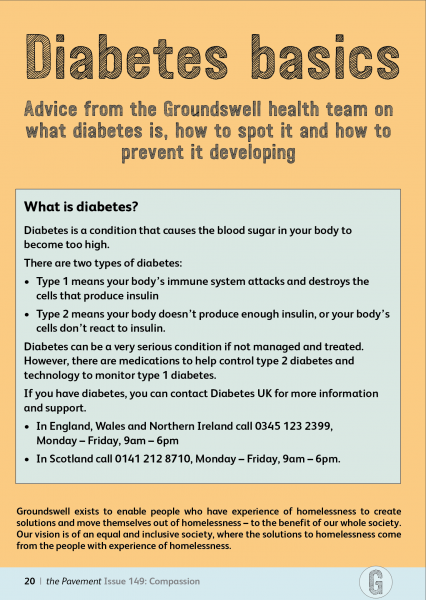 Advice from the Groundswell health team on what diabetes is, how to spot it and how to prevent it developing