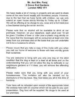 The invitation offers to help rough sleepers with food and blankets, while setting down rules on alcohol consumption and clearing up after dogs, and supposedly comes from a Mr and Mrs Faraj. If it is a scam, we would expect the address to exist, so it seems more likely to be a cruel joke by persons unknown.