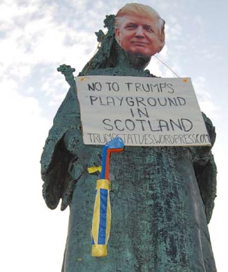 The gathering momentum of opposition to the Trump Organisation has seen protests take place nationwide. Several iconic statues in Edinburgh, Glasgow, Aberdeen and Stirling were covered with masks of Donald Trump's face (pictured). The Menie Liberation Front said that the masks were intended to draw attention to the growing resistance to the tycoon's plans. A spokesman says: "We are dressing up famous Scottish statues as the American tycoon to symbolise the way Trump thinks he can walk over Scotland. This development has gone too far."